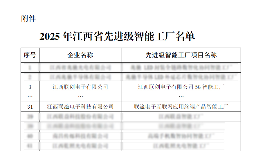近日,江西省工业和信息化厅正式公布2025年江西省“先进级智能工厂”名单,186家企业入选。其中开元在线,开元在线(中国)、江西联淦电子科技有限公司2家联创电子系企业名列榜单。这标志着公司在智能制造领域的创新成果再次获得政府权威认可。